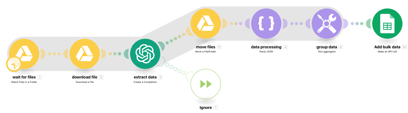 Effortlessly extract crucial data from any document using Make and OpenAI GPT4. Here's how it works: