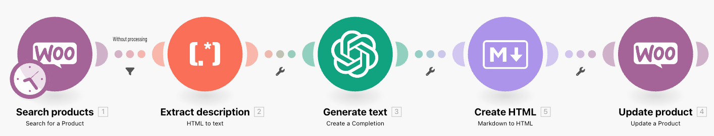 Automate product listing in WooCommerce effortlessly with Make and OpenAI's GPT-4 model. Simply enter the basic product information, and the system will generate a detailed description and catchy title automatically. Here's how it works: