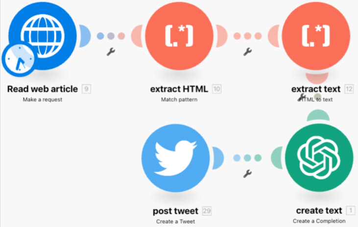 You can easily make automatic tweets from your articles using the powerful combo of Make and OpenAI GPT-4 in just a few simple steps. Let's have a look at how the procedure works: